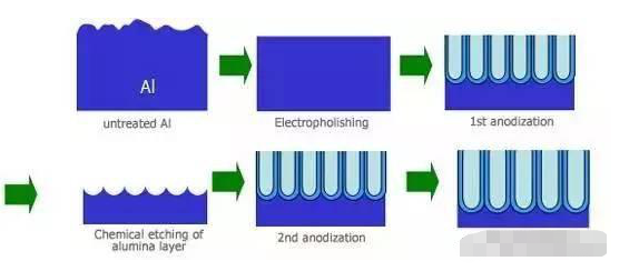 陽(yáng)極氧化:主要是鋁的陽(yáng)極氧化,是利用電化學(xué)原理,在鋁和鋁合金的表面生成一層Al2O3(氧化鋁)膜。這層氧化膜具有防護(hù)性、裝飾性、絕緣性、耐磨性等特殊特性。